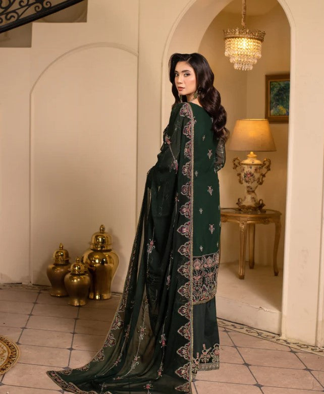 Emeralda radiates royalty in deep green chiffon, richly hand-embellished with intricate embroidery and organza borders. Paired with an embroidered chiffon dupatta and raw silk trouser, this ensemble is designed for weddings and festive gatherings with a touch of timeless grandeur.