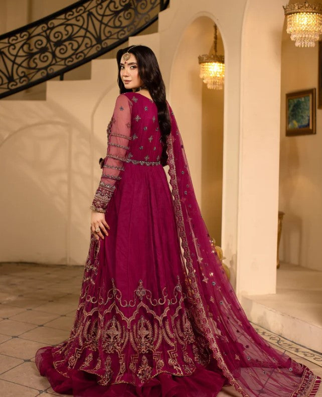 A royal maroon statement piece, Empressa features hand-embellished kaliyan and body on net with striking embroidery throughout. The design is completed with a luxury net dupatta finished with ornate pallus and a soft raw silk inner, creating a look of power and grandeur.